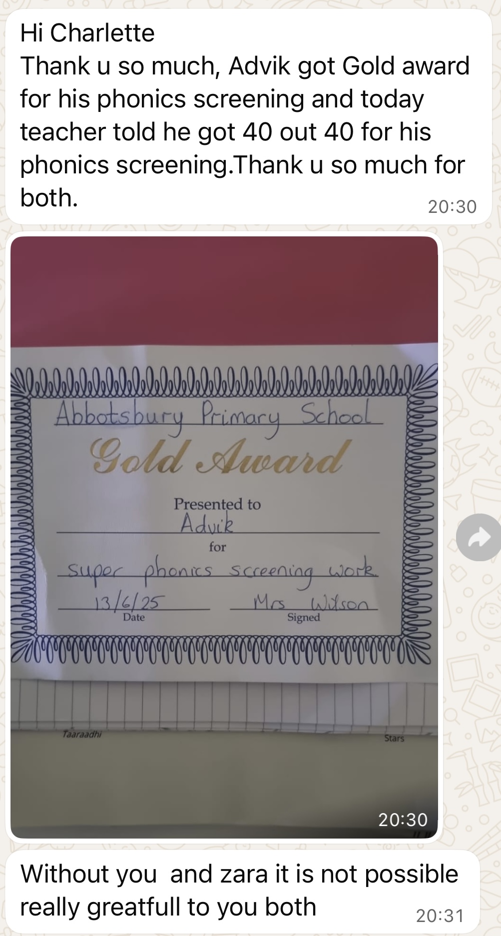 "My son has developed new love for reading. In the past two months (2 sessions per week) his blending skills have improved significantly and spellings too with tricky words. His class teacher also mentioned he is much faster in reading and attempts to read complex words at school. Charlotte keeps the class fun for the kids so it really helps. We are happy with the progress so far and looking forward to continuing our sessions with advance phonics classes." - Deepa Patel